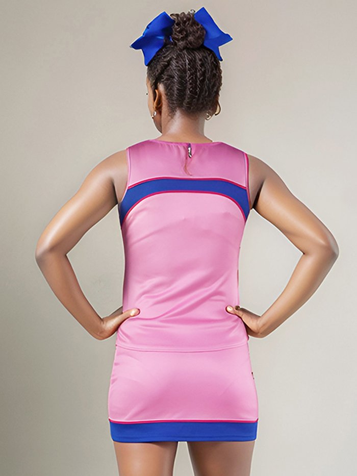 Show your strength and spirit with the Trojans Pink Ribbon tackle twill cheer uniform! This eye-catching set features a sleeveless V-neck top in soft pink with bold blue contrast panels and a striking tackle twill Trojans logo paired with a symbolic pink ribbon—perfect for supporting awareness events and community pride. The coordinating pink skirt is accented with a vivid blue hemline for a clean, sporty finish.