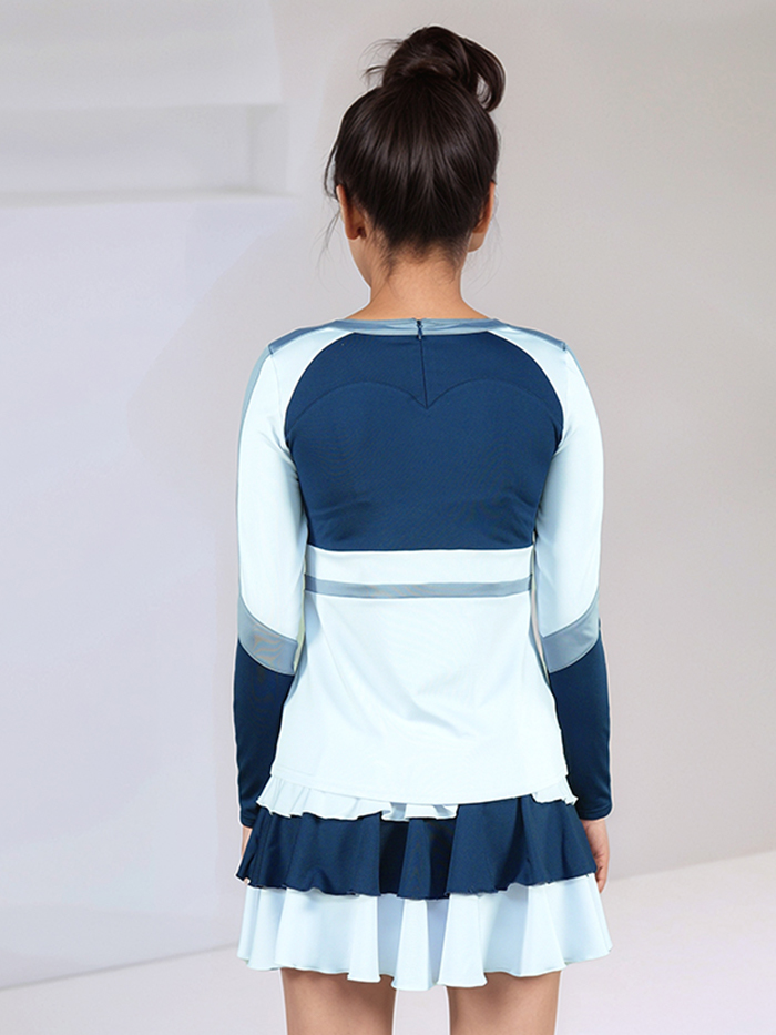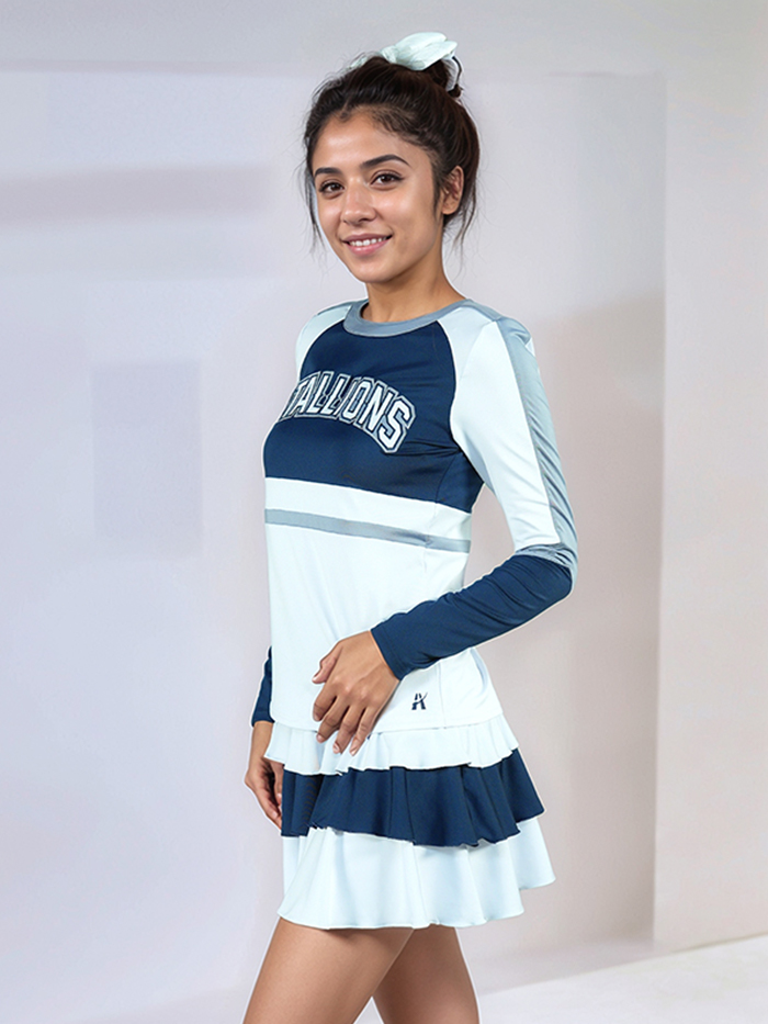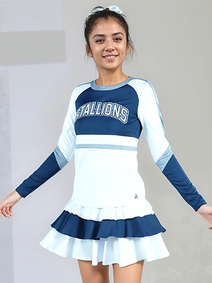 Skirt: Double-layered pleated skirt in alternating light blue and navy panels, creating eye-catching motion with every cheer and dance move.