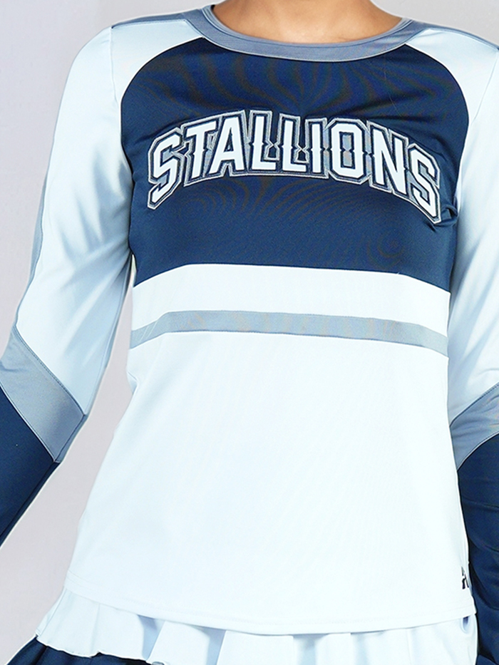 Top: Long-sleeve color-blocked top in soft blue and navy with silver stripe accents. Bold “STALLIONS” lettering is stitched across the chest using durable, high-quality tackle twill for a 3D varsity look.