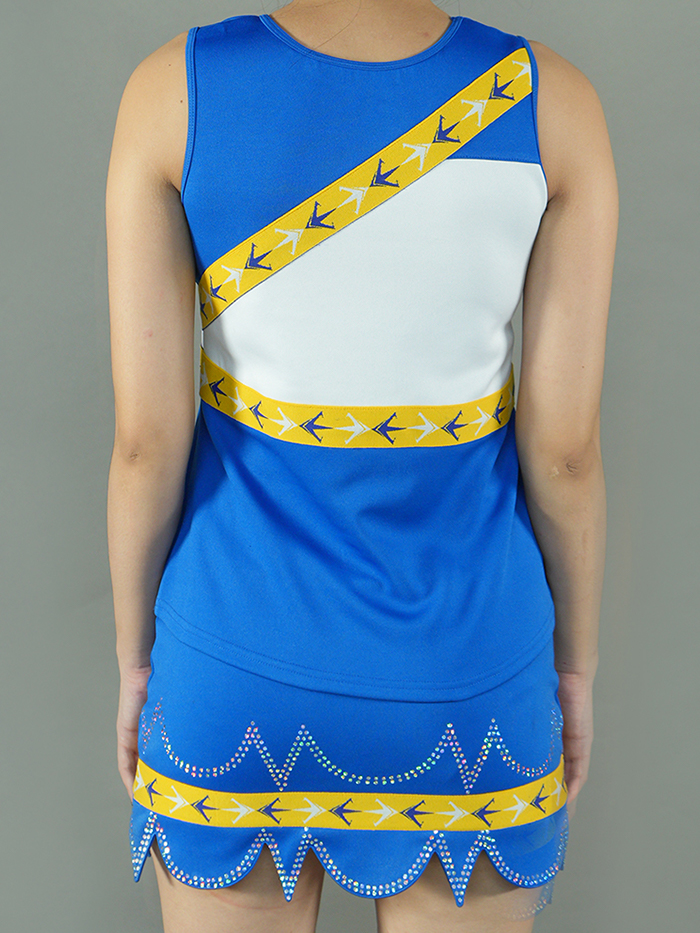 Add a burst of personality to your cheer look with the TCL047 “Collective” Uniform – a bold and playful design featuring custom woven trim with unique yellow star patterns. This asymmetrical top combines a classic royal blue base with a diagonal white insert and golden woven band for extra flair. The matching skirt features a scalloped hemline accented with shimmering spangles and a continuation of the special pattern trim, making this uniform a total standout on the mat or sideline.