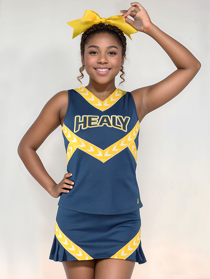 Cheer loud and proud in the TCL051 “HEALY” Uniform – a classic sideline silhouette brought to life with bold detailing. This navy cheer set features bright yellow chevron-pattern woven trim, creating dynamic V-shaped accents across the chest, waist, and skirt. The top showcases tackle twill lettering for a polished, high-impact look, while the matching skirt features inset pleats and custom trim that add motion and flair with every step.
