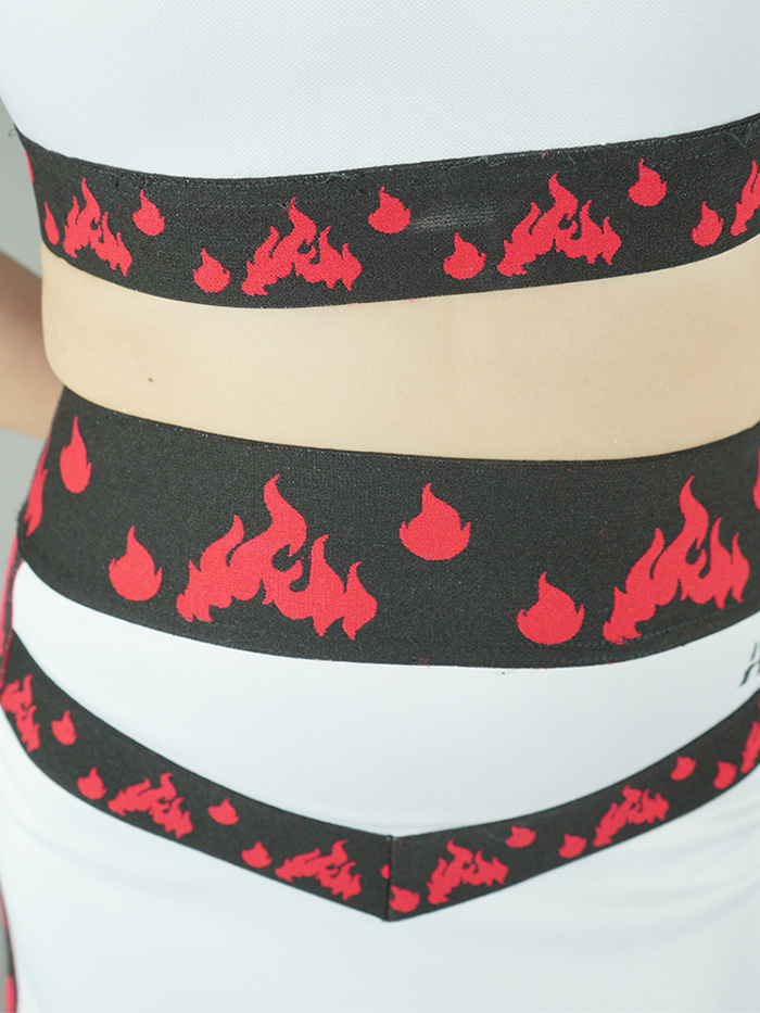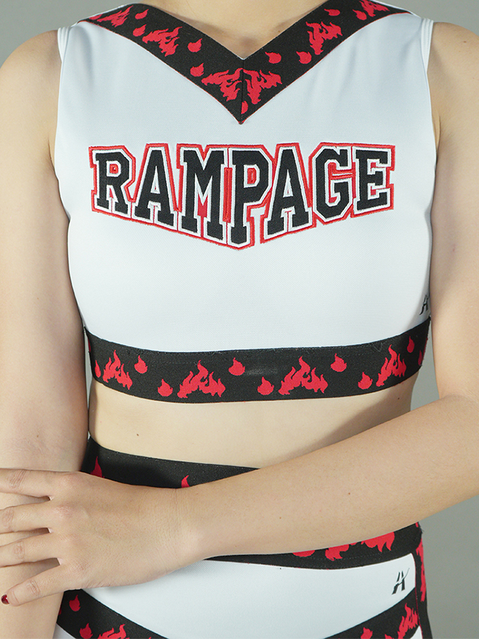 Bring the heat to the floor in the TCL057 “RAMPAGE” Cheer Uniform – a fierce, fiery design packed with personality. This cropped cheer top features bold tackle twill lettering and is trimmed with custom flame-pattern woven tape, adding energy and attitude across the neckline, waistband, and skirt. The matching skirt includes vertical flame panels and angled trim, creating a sharp, eye-catching silhouette that moves with power and style.